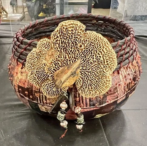 Learn to collage on a gourd and then add Gelato iridescent paint sticks. These are water based and heat set. Linework detail can be added as a special touch. Rim work, beads, and botanicals will be added as a finishing touch. All materials are provided. However, students can bring their own paper for collage if preferred and are encouraged to do so. Just make sure that your paper is not too thick to mold around the gourd when dampened.