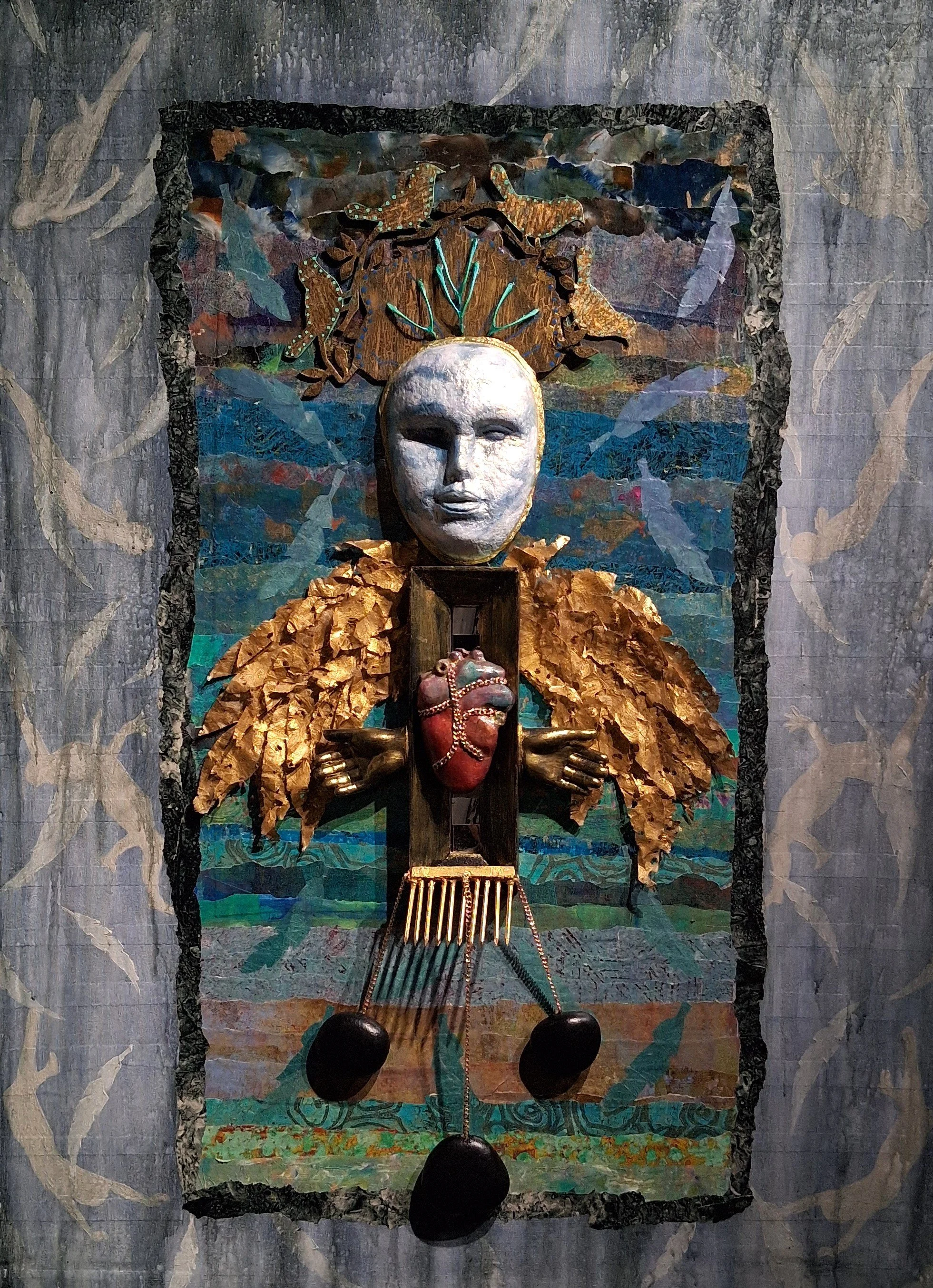 From a distance this is intriguing. The floating details on the soft blue background offset the deeper teals in the rectangle holding the unique figure. The foam face, the heart clenched in gold chains, the gold feather forms and the wishbones kept me returning to view more. It caught my attention and kept it.